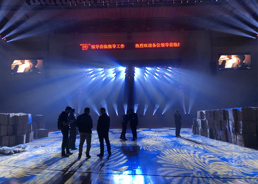 其中體育館應用了近380支燈具。其中均勻分布在體育館內應用了77支440W三合一搖頭電腦燈DREAM440BSW,6支1400W圖案切割電腦燈DLW1400LITE-P,2支DLW 1400 FOLLOW追光燈。