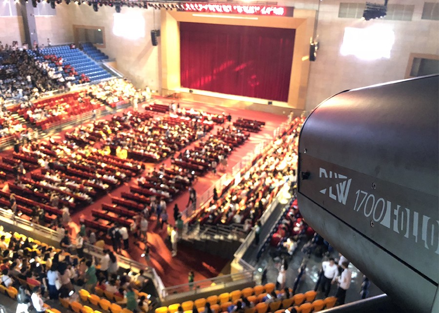 中山大學新華學院東莞校區體育館舞臺燈光系統由銳聲旗下代理品牌產品V-light和筑夢DLW系列燈具打造。